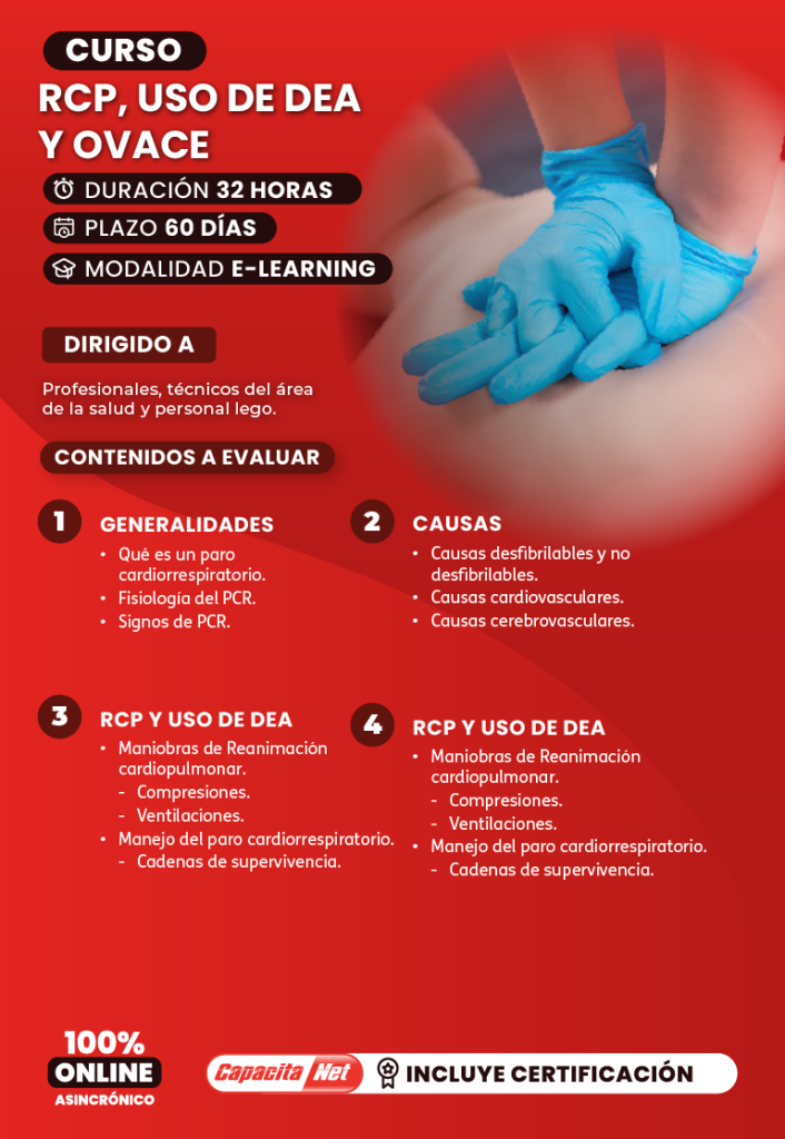 Con este Curso de Reanimación cardiopulmonar (RCP) 32 horas serás capaz de aplicar estrategias para tratar las emergencias de reanimación cardiopulmonar, obstrucción de la vía área y OVACE.